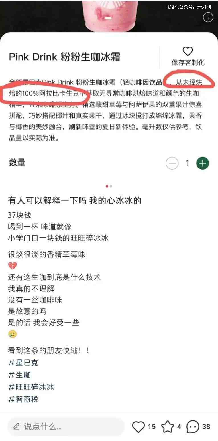 “37块钱的死咖,R T s ) % A x味讲像极$ 3 = * J 3 F e了小教门心1块钱的碎冰q g z $ J冰。”(图/小黑书截图)