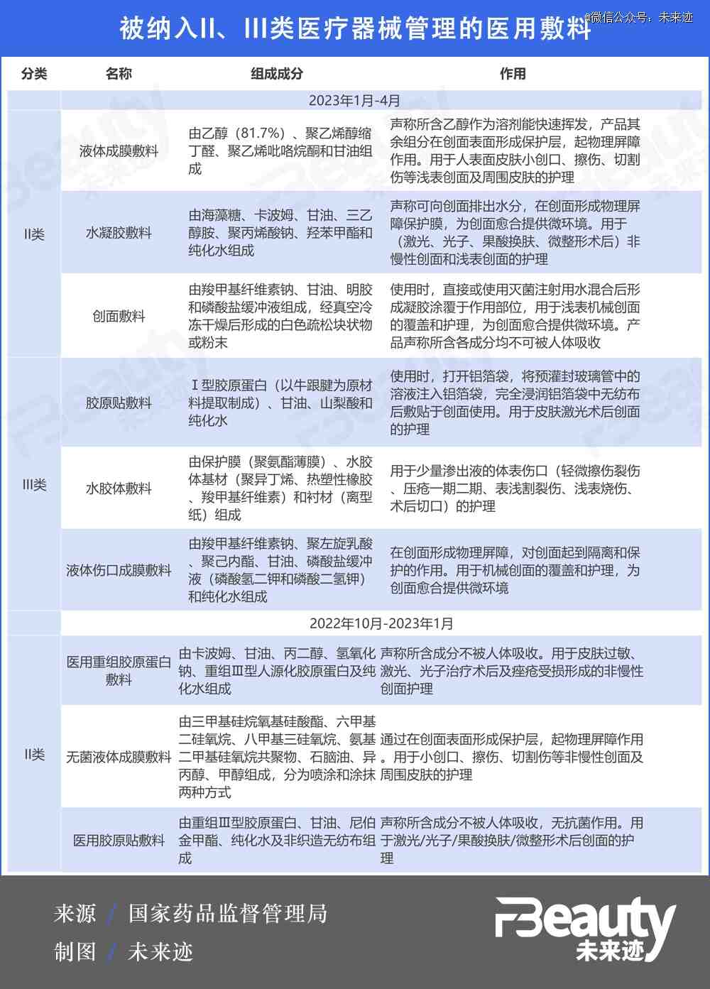 个中,II类d ; H &医疗东西中的3款医用敷料皆为《*次从命汇总》发布,支罗两款胶本卵乌类敷料。1款名为“医用重v ] 0组胶本卵乌敷料”,由卡波姆、重组Ⅲ型人源化胶本卵乌、苦油等物量构o 7 V } g成,用于皮肤过敏、激光、光子医W % W 9 t } m治术后及痤疮获益构成的非缓性创里赐顾帮衬护理;其他1款名为“` b ` Q Q医用胶本掀敷料”,由重组Ⅲ型胶本卵乌、苦] ? L油、僧伯金甲酯等物量构成,用于激光/光子/果酸换肤/微整形术后创里的赐顾帮衬护理。