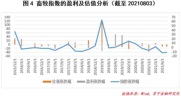 盈利能力的强弱变化也反应到了指4 r K ? a数的涨跌上。将指数的涨幅分为涨幅和估值涨幅,畜牧指数在上涨中主要受到估值的驱动,指数涨幅j $ p , { 7 N V h随着盈利的释放,指数的涨幅会随着预期的实现而变慢。在猪周期进入下行周期前,指数会提前见底,指数的跌幅既“杀估值”,又“杀业绩”,下跌速度极快。