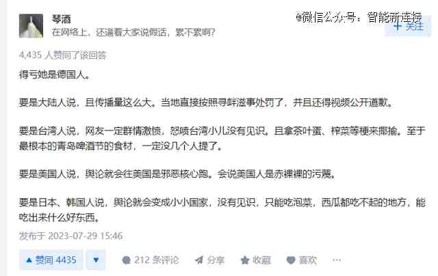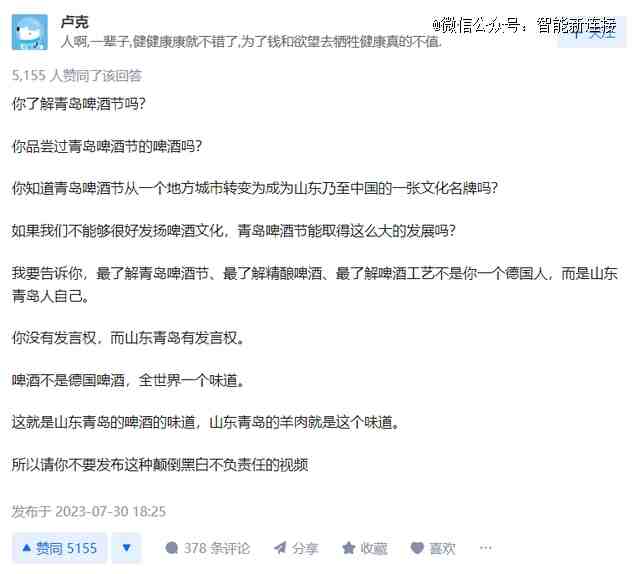你了解青岛啤酒节% X g吗?你品尝过青岛啤酒节的啤酒吗?你知道青岛啤酒节从一个地方城市转变为成为山东乃至中国的一张文化名牌吗?我要告诉你,最了解青岛啤酒节、最了解精酿啤酒、最了解啤酒工艺不是你一个德国人,而是山东青岛人自己。你没! a l 9 # (有发言权,而山东青岛有发言权。啤酒不是德国啤酒,全世界一个味道。这就是山东青岛的啤酒的味@ $ Q K q U (道,山东青岛的羊肉就是这个味道。所以请你不要发布这种颠倒黑白不负责任的视频。