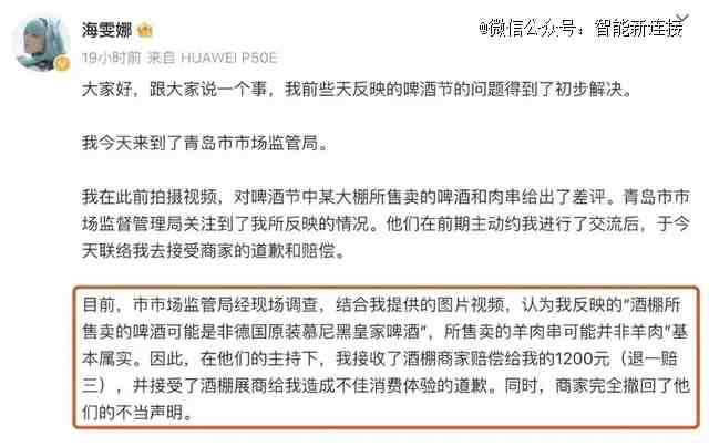 8月2日,德国女孩@海雯娜 发文称,青岛啤酒节商家售卖假啤酒假羊肉事件已经得到妥善解决) A s 2 0 p。