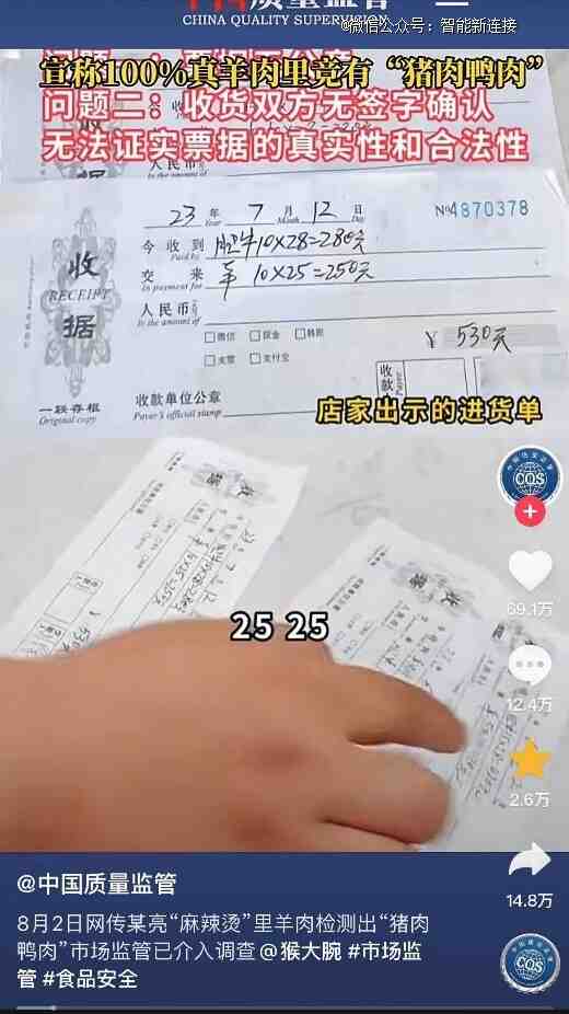 事实上,近期就有类似新闻,根据中国质量监管曝出来的消息,8月2日,网传某亮“麻辣烫”里宣称100%真羊肉里面竟然检测出“猪肉鸭肉”,而进货单上收货双方都0 , 6 y J无签字确认,无法证实票据的真实性Y @ / \ \与合法性,目前市场监管已经介入调查。