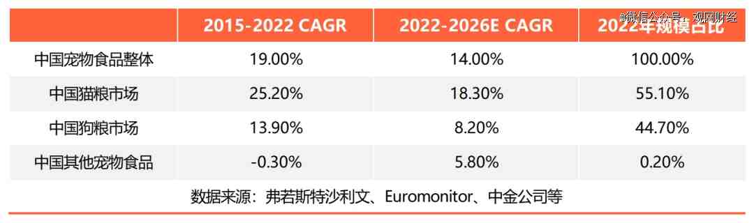 弗若斯特沙利文数据显示,2022年中国宠物食品、宠物用品和宠物医疗e J R及服务市场三大赛道,其规模分别为1136亿元、416亿元和1062亿元;2015a J ; ~-2022年,三者CAGR分S [ e c a t别为19.0%、15.6%和17.7%。两项指标里,宠物食品赛道的排名均靠前。
