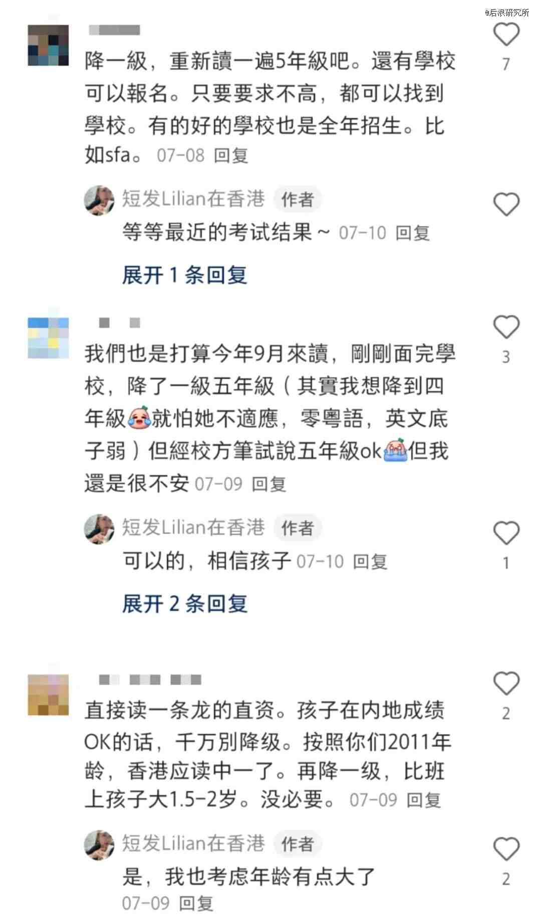 很多人给我出主意,让女儿降到香港五年级,花一年时间适应环境,– 2 % &同时学习英语和粤语。我认真问过女D i 1 G B ( u 7儿的想法,她有点抗拒和低年级小朋友同班,还可能会被嘲笑。还有一种方法是找教育局派位,只能保证有学上,但是学校质量是未知数。