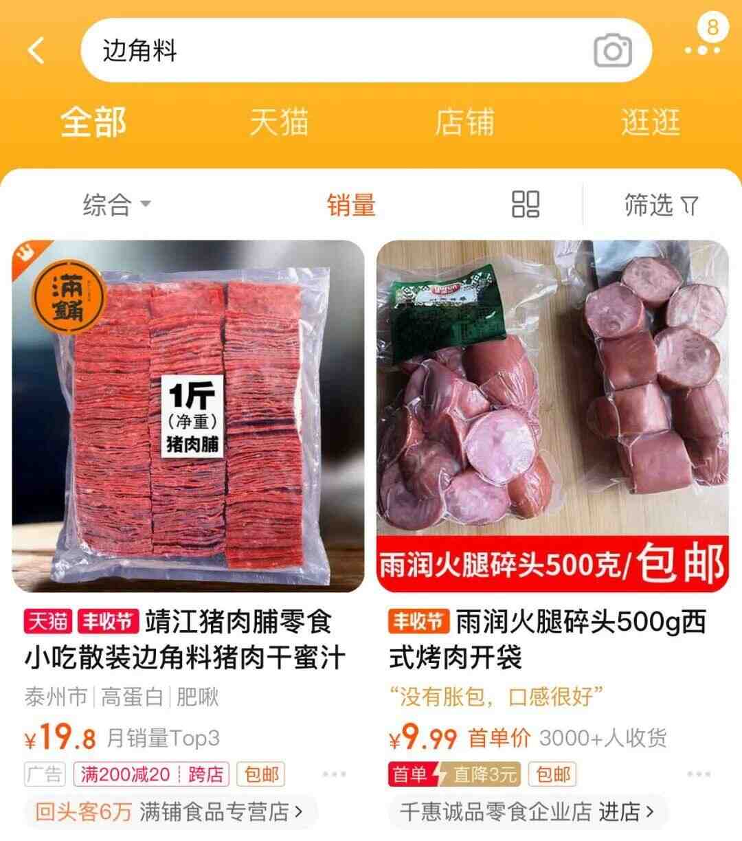 打开淘宝,搜索边角料,有品牌认证的边角料集中在肉干这一类别上,小碎肉被做成了和普通肉干同样包装的产品,月销量相当可观。对于肉干企业来说,肉干的边角料,相对面包,不仅保质期更长,能节约的成本也更高,因此可操作性也就更强。