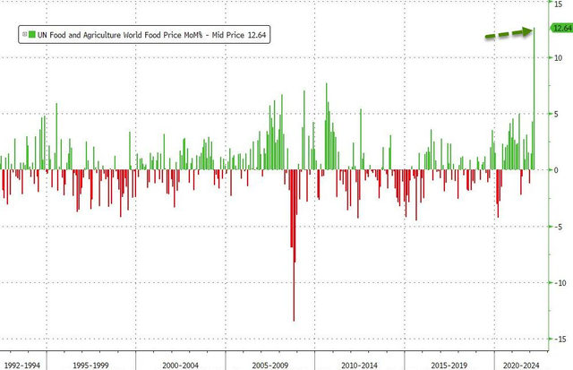 他指出,如果俄乌危机持续,在最坏的情况下,各国禁止出口,食品价格可能会大幅上涨,涨幅远远超过联合国目前警告的22%。