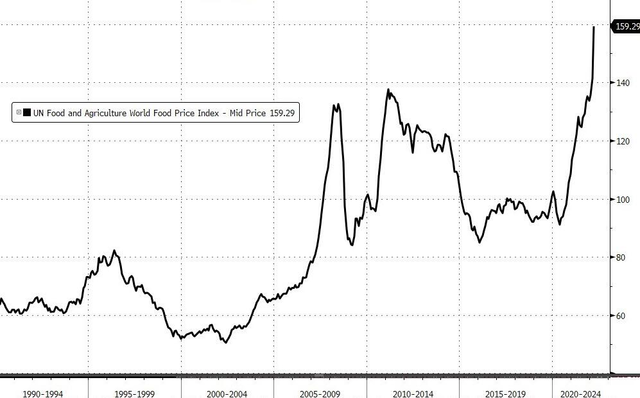 数据显示,联合国粮农组织3月份的食品价格指数连续第三次创下历史新高,较去年同期跃升34%。该组织称这是一次价格的“巨大飞跃”。