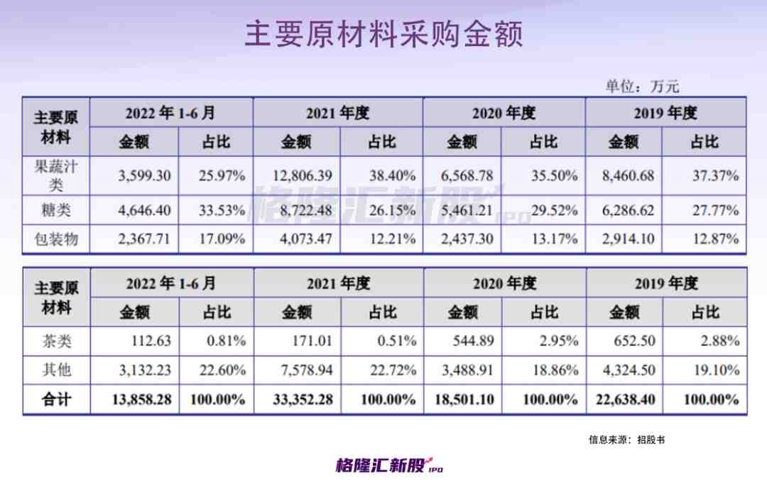 可以发现,公司主要原材料为果蔬汁类、糖类、茶类等,前述原材料成本占公司主营业务成本的比例超过50%,占比较高。该等原材料系农副产品加工制成,其价格受到气候条件、产地产量、市场供求等因素的影响较大,价格围绕价值波动较为频繁。报告期内,德馨食品的主要原材料采购金额从2019年的2.26亿元增至2021年的3.34亿元。