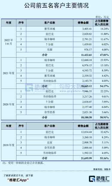 报告期内,德馨食品来自前五大客户的销售收入分别为2.17亿元、1.82亿元、2.87亿元、1.14亿元,公司销售收入主要集中在星巴克、瑞幸咖啡、7分甜、书亦烧仙草、蜜雪冰城等客户。其中,2021年德馨食品对瑞幸咖啡的收入增长较多。一方面,瑞幸咖啡业务规模大幅增长引致对公司采购增长较快;另一方面,瑞幸咖啡对公司植物蛋白饮料浓浆新产品采购量大幅增加引致公司对瑞幸咖啡销售的大幅增加。