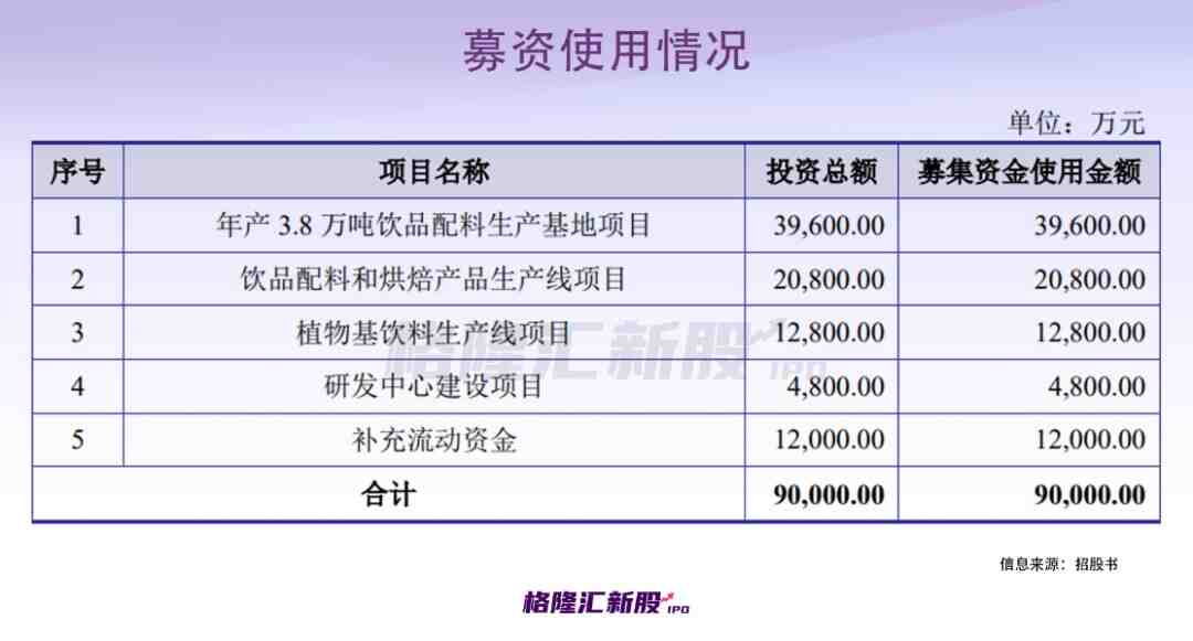 本次IPO拟募集9亿元,主要用于年产3.8万吨饮品配料生产基地项目、饮品配料和烘焙产品生产线项目、植物基饮料生产线项目、研发中心建设项目等,旨在进一步扩大产能、优化产品结构,提升核心竞争力。