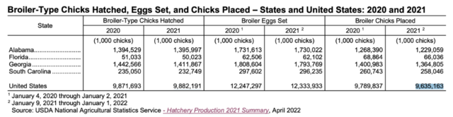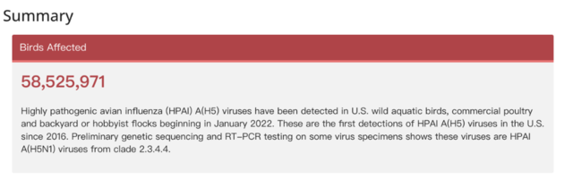 根据疾病控制中心的数据,美国有将近5900万只家禽(主要是鸡和火鸡)受到影响,疫情影响州达到47个,这是有史以来最致命的疫情。不过2021年美国用于肉类生产的肉仔鸡总量为96.4亿只,家禽影响数量占比不足1%。