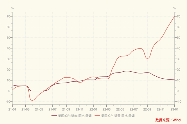 禽流感对鸡蛋价格的影响比鸡肉更大。以美国为例,1月美国鸡肉价格同比上涨10.5%,但鸡蛋价格同比飙升70%。一些州蛋价更是在一年里翻了两倍,在加利福尼亚州,一打大鸡蛋的平均零售价最近跃升至7.37 美元,远高于12月初的4.83美元和去年同期的2.35美元。