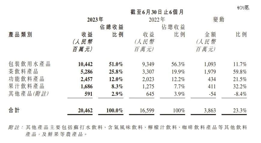 分品类来看,农夫山泉包装水、茶饮料、功能饮料、果汁饮料四个品类都在增长,其中茶饮料尤为亮眼,实现了52.86亿元的营收,同比增长59.8%。