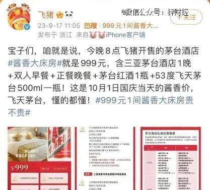 近日,阿里旗下飞猪发布与茅台的合作信息,推出“999元一晚起的酱香大床房”。根据多家媒体报道,该价格含三亚茅台酒店1晚+双人早餐+正餐晚餐+茅台红酒1瓶+现场品鉴53度飞天茅台500ml一瓶。
