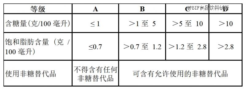 其中A、B两个级别的饮料中含糖量和饱和脂肪量相对较低,C、D级别的饮料中含糖量和饱和脂肪量相对较高——每100毫升的饮料中有超过5克糖和1.2克饱和脂肪的饮料属于C级,10克以上糖和2.8克以上饱和脂肪为D级。