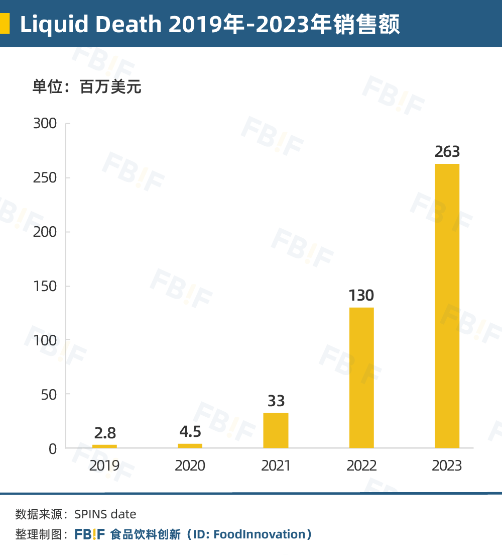由于品牌定位小众,且擅长用出格的广告吸引眼球,Liquid Death一度不被看好。但到2023年,Liquid Death销售额已达2.63亿美元,连续三年实现超过三位数增长,成为美国增长最快的非酒精饮料品牌之一[2]。