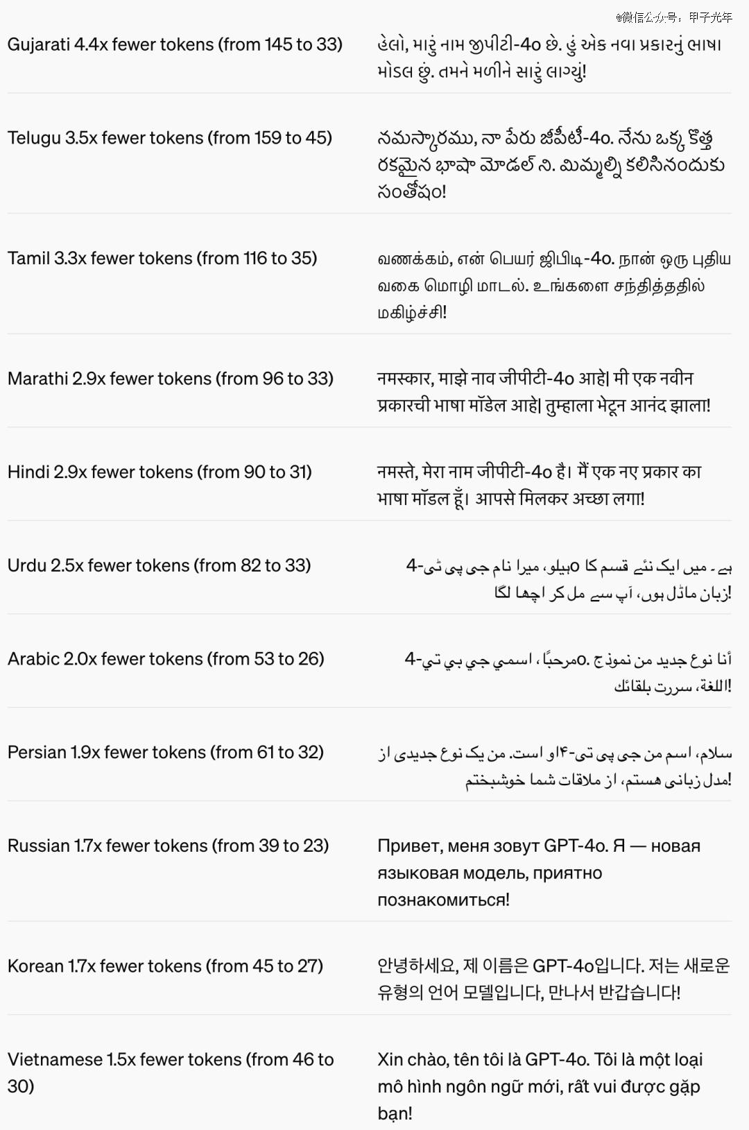 GPT-4o还有超高的“语言天赋”,能支持50种语言,并显着提高了非英语语言的性能,包括改进分词器以更好地压缩其中的许多语言: