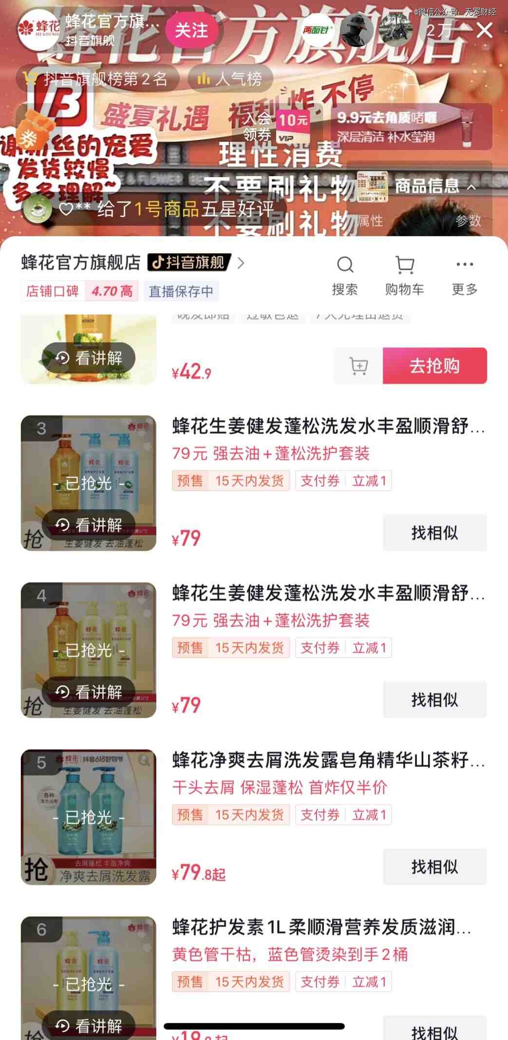 蜂花抖音官方旗舰店的3款79元套餐均被抢光,图片来自抖音。