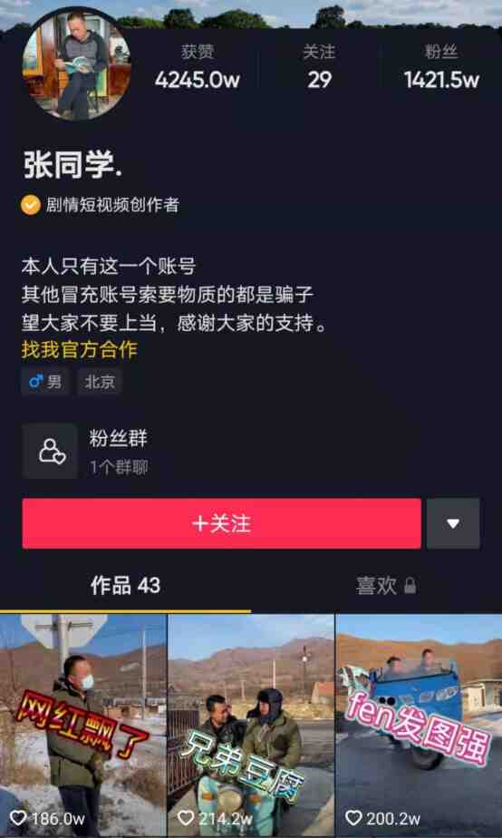 冲着这个人设演绎,10月4日,张同学的*个视频上A u a e f p 5线,到了12月7日,张同学一共发了43个视频,累计粉丝1421万。